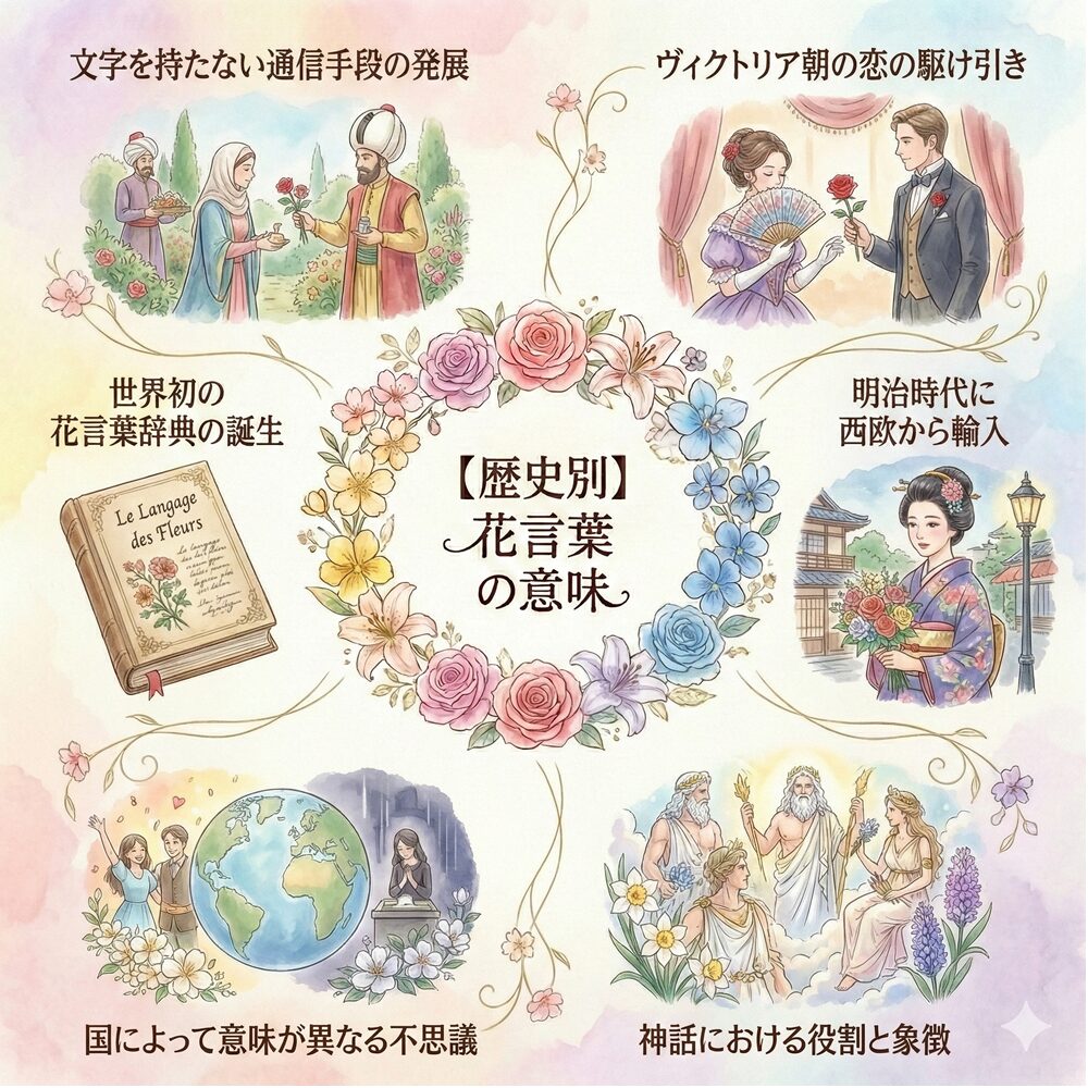 一輪の花に愛や感謝、時には秘めた決意を託す「花言葉」。私たちは何気なく日常で使っていますが、その起源がどこにあり、なぜ世界中でこれほどまでに親しまれているのかをご存じでしょうか。花言葉は単なる植物の紹介ではなく、歴史的な背景や神話、そして贈る人の心を映し出す鏡のような存在です。