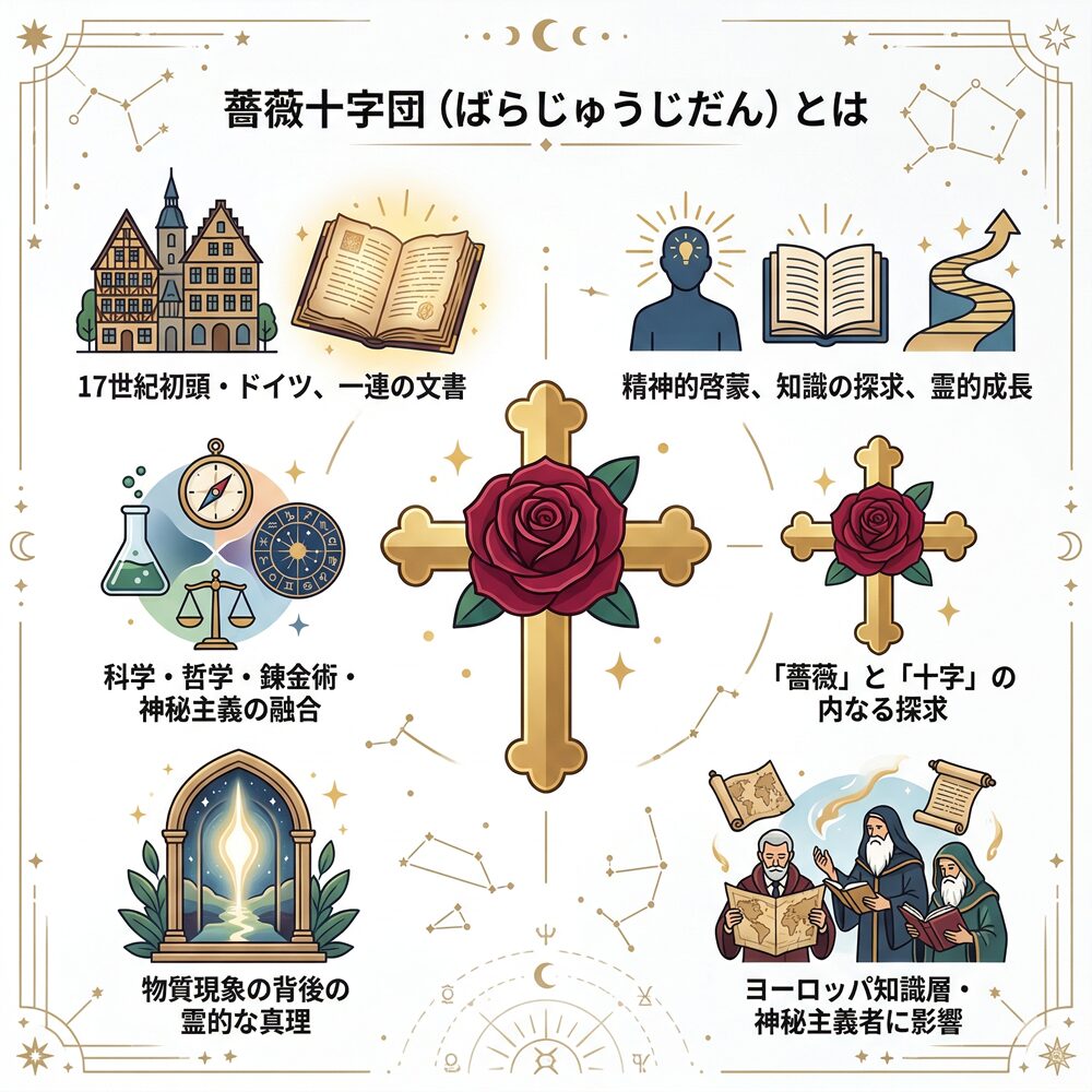 薔薇十字団(ばらじゅうじだん、英語:Rosicrucian Order)は、17世紀初頭のヨーロッパで登場した神秘思想の秘密結社で、精神的な啓蒙、知識の探求、霊的な成長を目指す団体とされています。薔薇十字団は、科学、哲学、錬金術、神秘主義の教えを融合させ、物質的な現象の背後にある霊的な真理を追求することを目的としました。薔薇十字団の存在は、ヨーロッパの知識層や神秘主義者に大きな影響を与え、秘密結社の概念や象徴に関する多くの伝説や物語が生まれるきっかけとなりました。