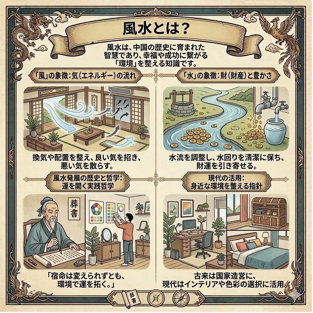 風水とは、中国の長い歴史と経験に裏打ちされた智慧であり、私たちの幸福や成功を左右する「環境」を整えるための知識体系です。