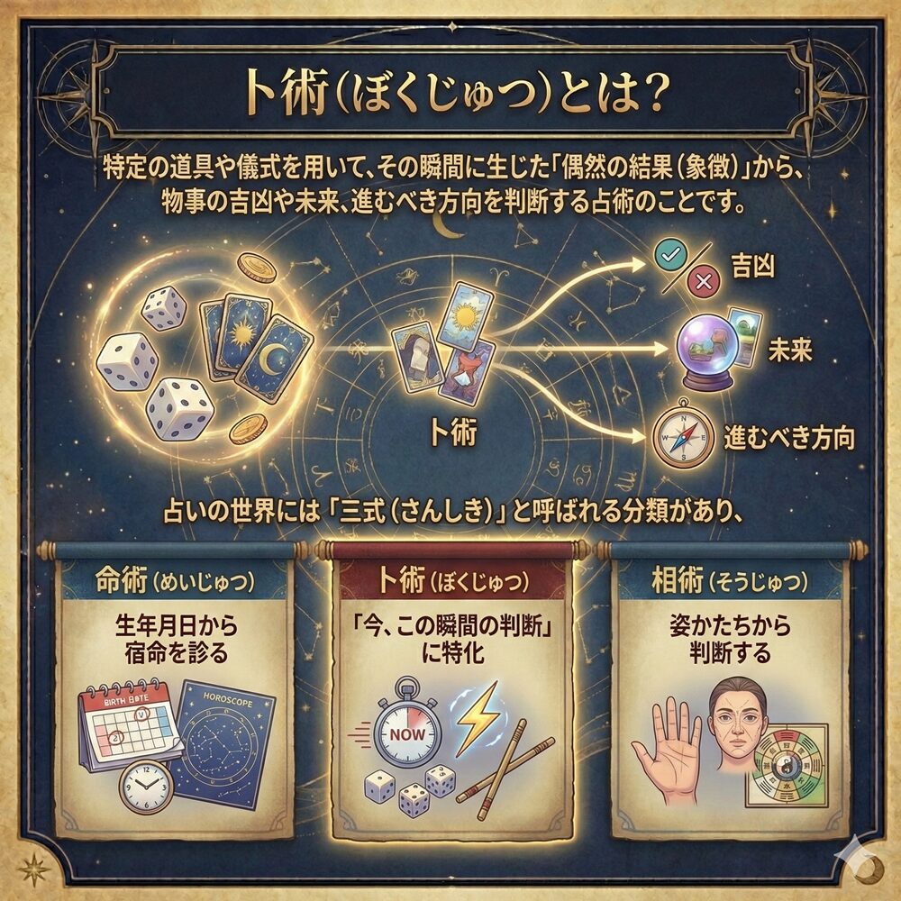 占いの世界には「三式(さんしき)」と呼ばれる分類があり、生年月日から宿命を診る「命術(めいじゅつ)」、姿かたちから判断する「相術(そうじゅつ)」に対し、卜術は「今、この瞬間の判断」に特化しています。