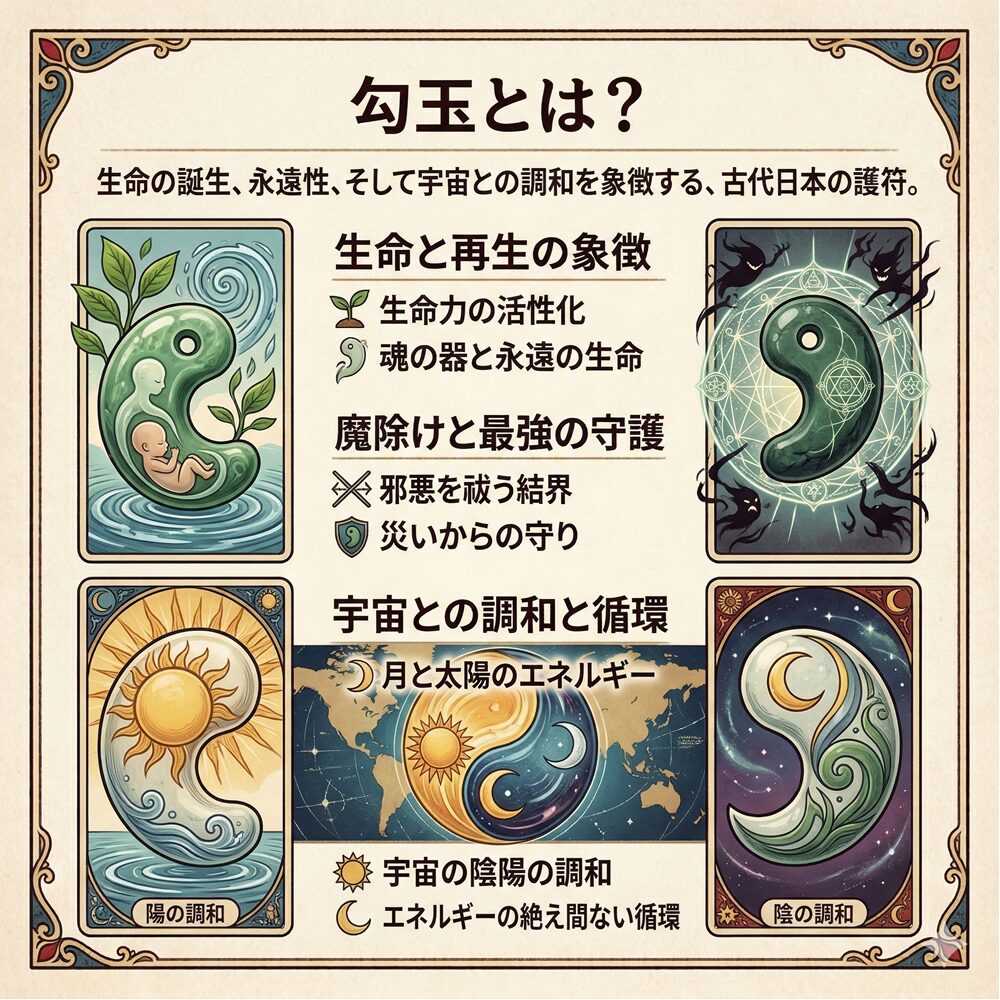 スピリチュアルな観点から見ると、勾玉の形状そのものが「魂の形」を象徴しており、持ち主の生命力を活性化し、外部からの邪悪なエネルギー(邪気)を強力に祓う結界の役割を果たします。勾玉の叡智を理解することは、自己の魂のルーツに繋がり、最高の守護と活力を得るための鍵となります。