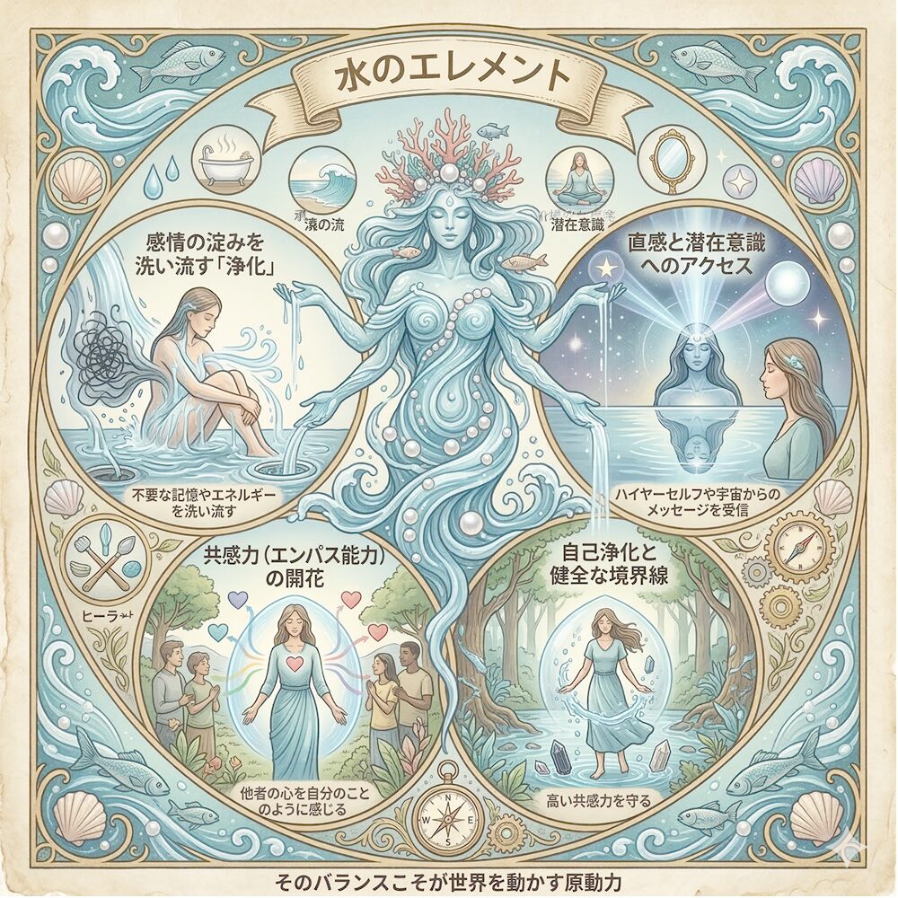 他者の心を自分のことのように感じる「エンパス」の力は、水のエレメントの真骨頂です。この力を正しく扱うことで、ヒーラーとしての才能を発揮したり、周囲の人々を無意識のうちに癒したりする存在になれます。ただし、この高い共感力を守るためには、自分を浄化し、健全な心の境界線を保つことが不可欠です。