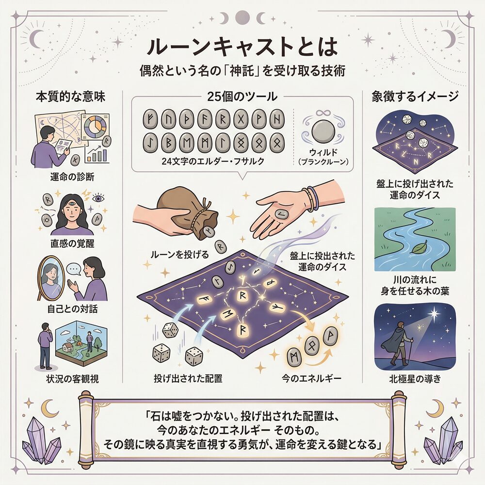 ルーンキャストとは、文字通りルーンが刻まれた石や木片を「投じる(キャスト)」こと。偶然の中に必然を見出し、バラバラに散らばったシンボルから、あなたの深層心理や未来の予兆を編み上げていきます。それは単なる「当て物」ではなく、あなたの内側に眠る「野生の知恵」を呼び覚ます儀式。今回は、石たちが語るささやきを正しく受け取り、現実を動かす力に変えるための方法を紐解いていきましょう。