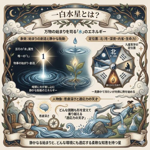 六白金星とは、生年月日から導き出される九星の一つで、五行の「金」の属性を持っています。しかし、同じ金の属性を持つ七赤金星が「精錬された楽しい金属」を表すのに対し、六白金星は「磨き抜かれた刀」や「宇宙そのもの」を象徴します。