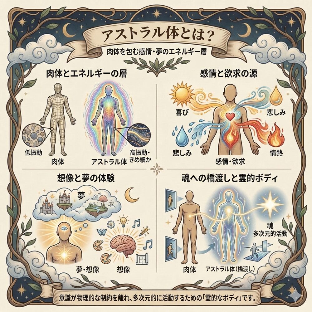 アストラル体は、私たちが物質的な制約を超えて「より広い世界」を体験するための、素晴らしい魂の乗り物です。感情を豊かに感じること、夢を大切にすること、そして直感を信じることは、すべてこのアストラル体を慈しむことに繋がります。