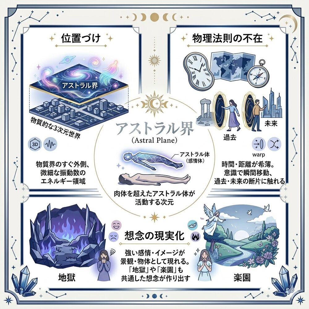 アストラル界(Astral Plane)は、肉体を超えた「アストラル体(感情体)」が活動する次元です。