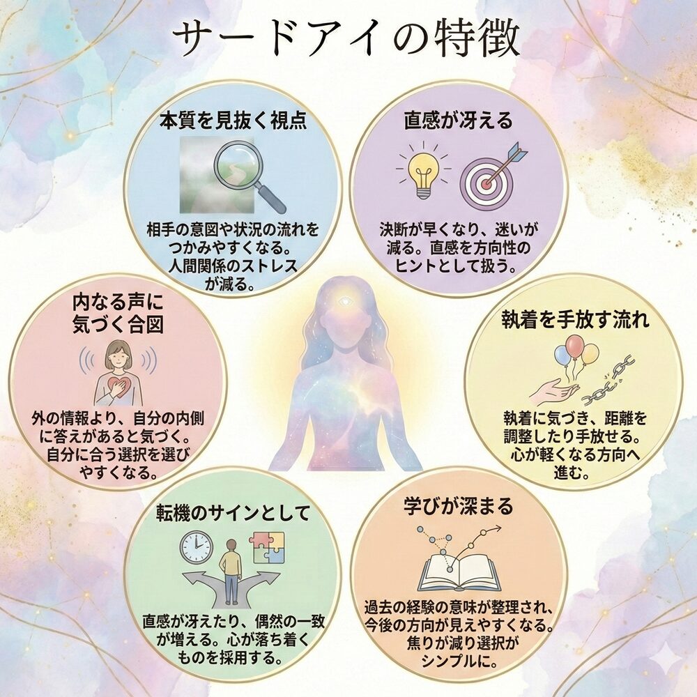 スピリチュアルでは、サードアイは「内なる声に気づく」「学びが深まる」といった役割で語られます。人の言葉に振り回されず、自分の感覚で選べるようになるイメージです。人生の転機で、選択の軸がはっきりする人もいます。ただし“意味づけ”を頑張りすぎると疲れるので、ほどほどがコツです。