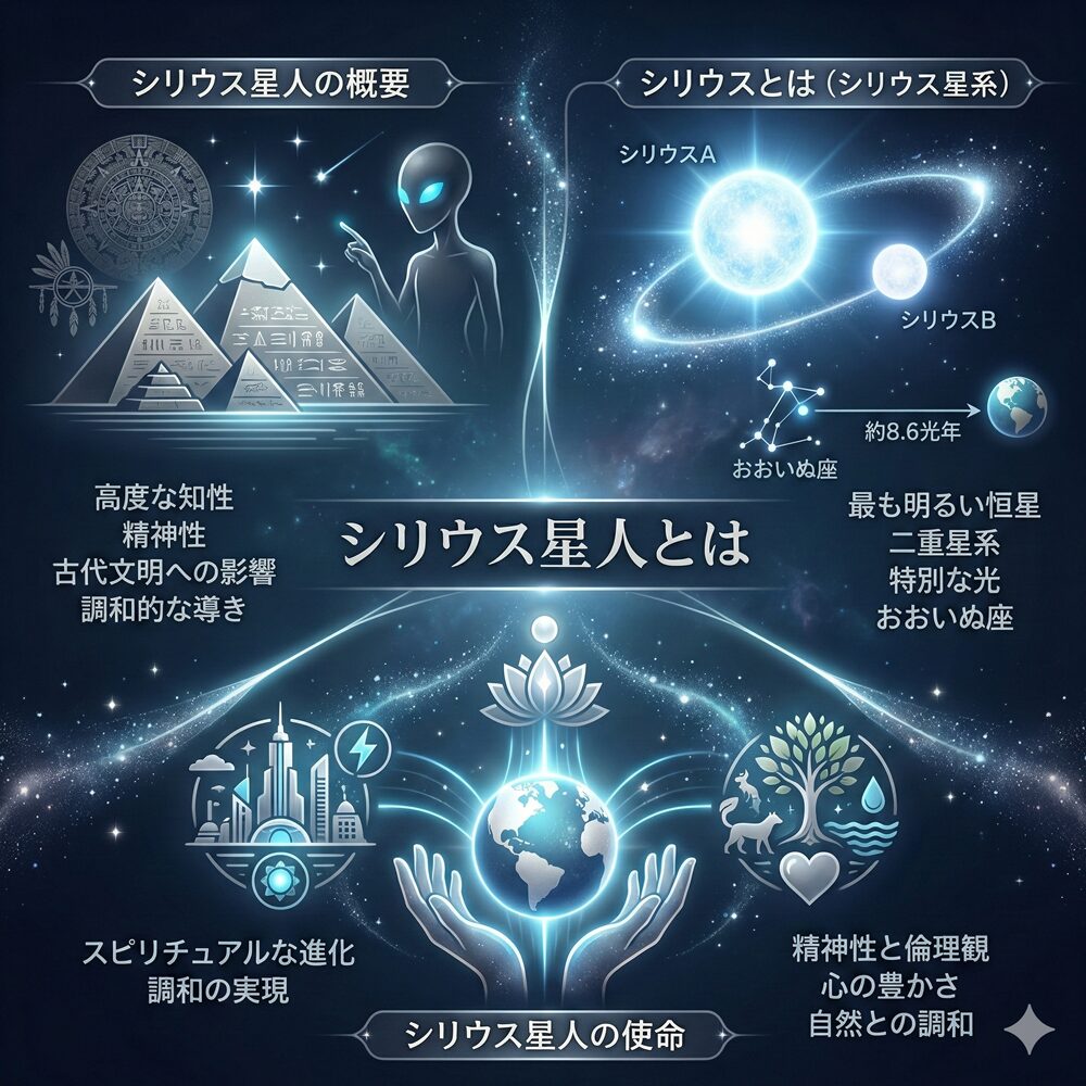 シリウス星人は、「シリウス」と呼ばれる恒星系からやってきたとされる宇宙存在であり、古代エジプトやマヤ文明、ネイティブアメリカンの伝承など、世界各地でその影響が示唆されているといわれます。