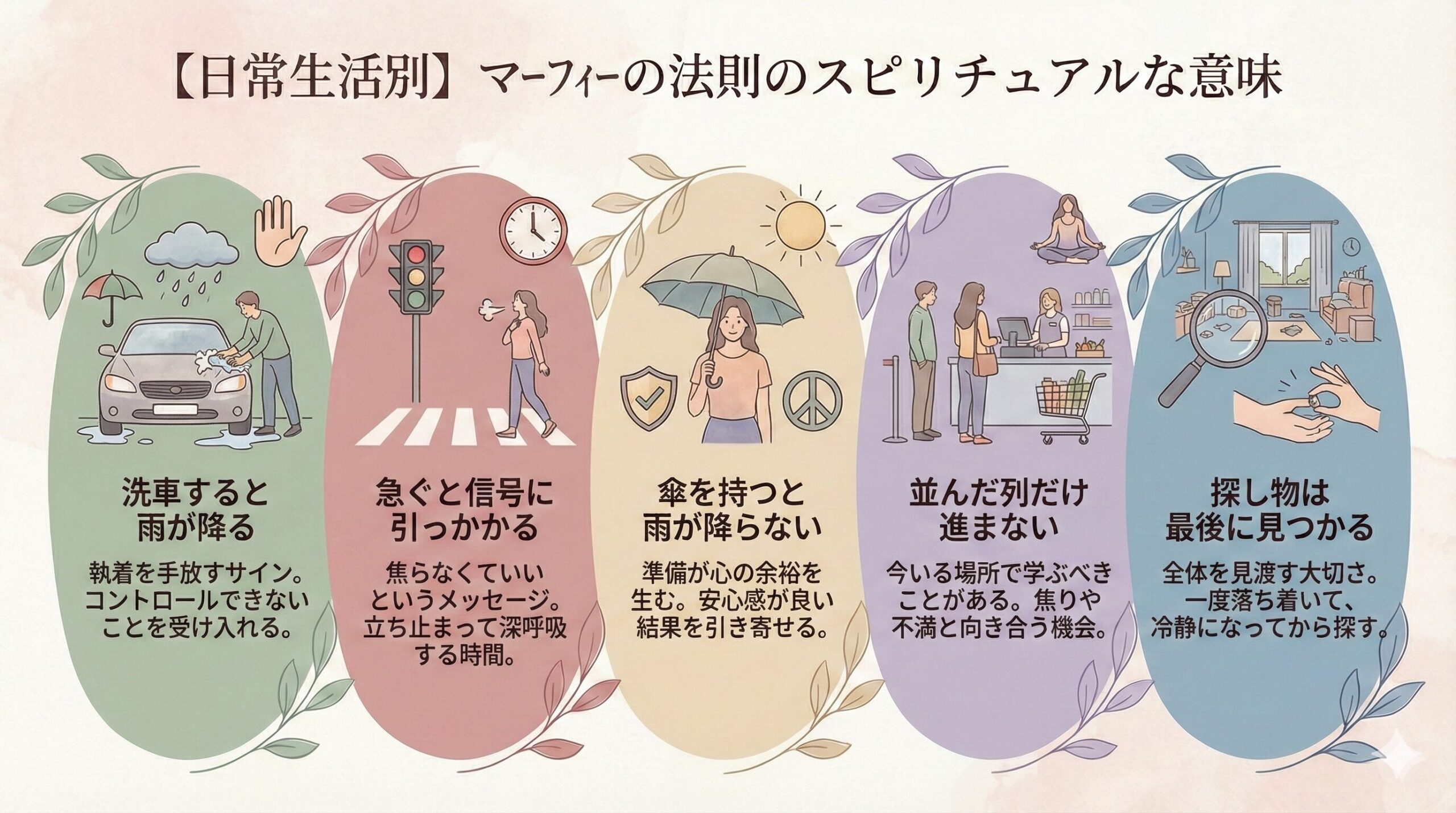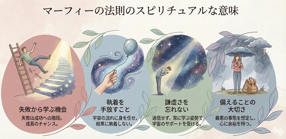スピリチュアルな視点から見ると、マーフィーの法則は私たちに多くの学びを与えてくれます。失敗を通じて成長する機会、執着を手放すことの大切さ、謙虚さを保つことの重要性、そして事前に備えることの価値を教えてくれているのです。