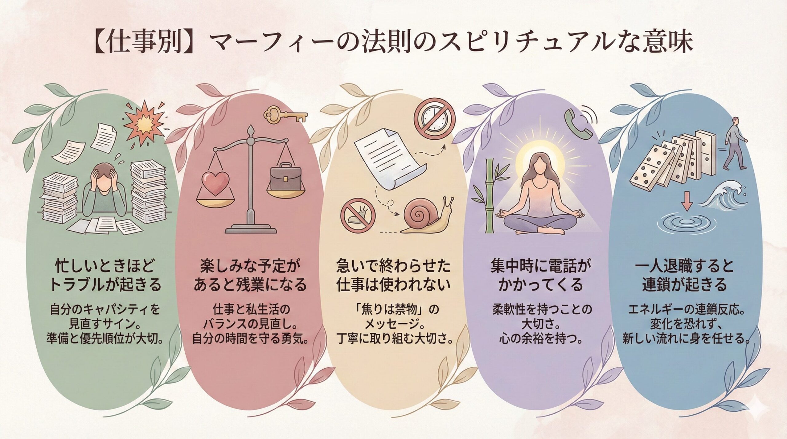 マーフィーの法則は「失敗する可能性があるものは必ず失敗する」という考え方です。スピリチュアルな視点では、これは宇宙が私たちに学びの機会を与えてくれているサインと解釈できます。