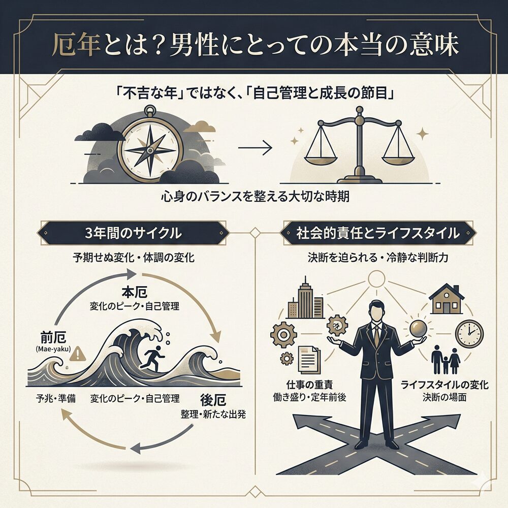 厄年は単なる「不吉な年」ではありません。人生の節目において心身のバランスを崩しやすい時期を指し、特に男性は仕事の重責やライフスタイルの変化が重なるタイミングです。この時期を「自己管理を徹底する時期」と捉えることで、その後の人生をより強固なものにできます。