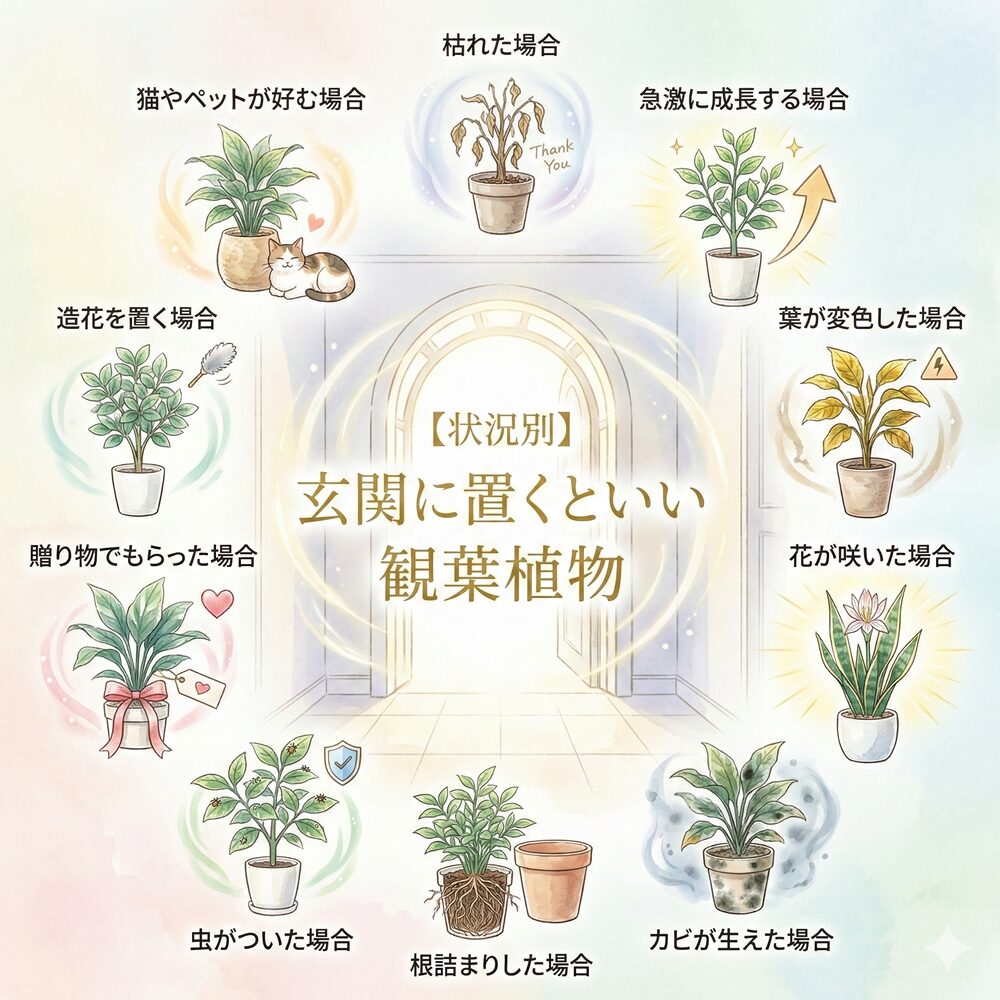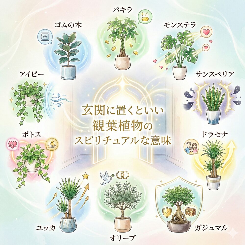 家の顔である玄関は、風水においてすべての「気」の入り口とされる最重要スポットです。「旺気(おうき)」と呼ばれる良い気も、「殺気(さっき)」と呼ばれる悪い気も、すべてここから入ってきます。玄関に置くといい観葉植物は、邪気を払い、良い気を増幅させる天然のパワーアイテムとしての役割を果たします。この記事では、玄関に最適な観葉植物のスピリチュアルな意味を、種類、状況、特徴・方角別に30選紹介します。運気を底上げする選び方を知り、あなたの家に幸運を招き入れましょう。