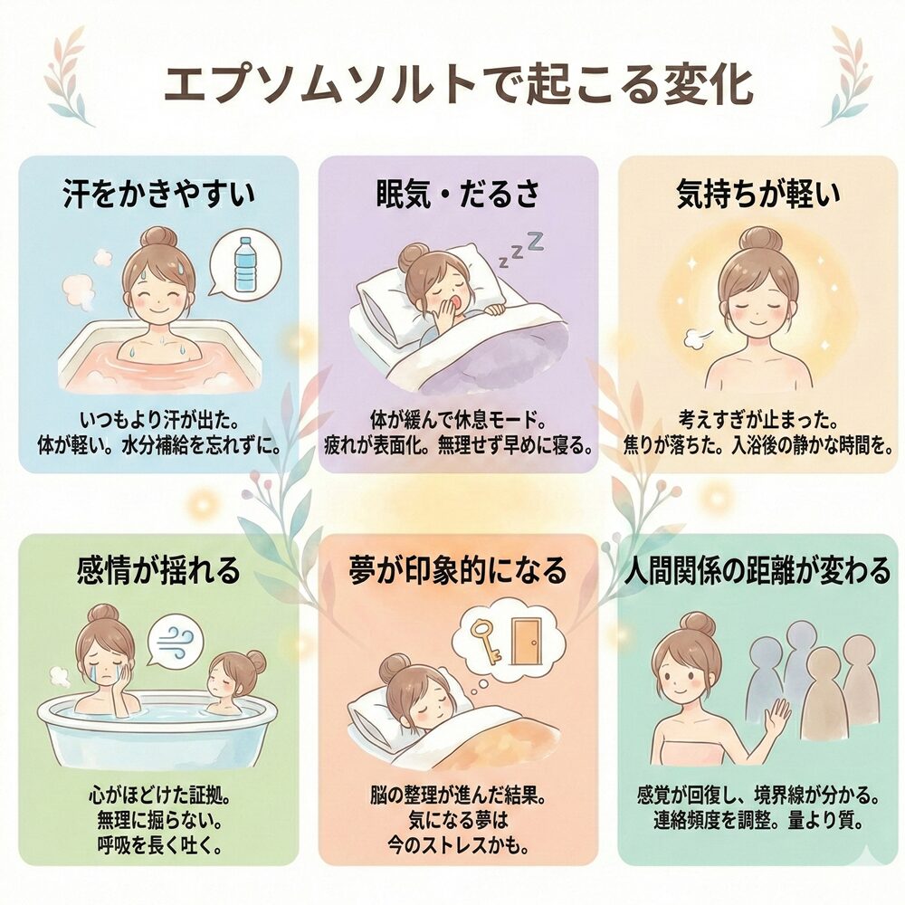 エプソムソルトは、湯船に入れることで「いつもより温まった気がする」「汗をかきやすい」と感じる人がいます。お風呂時間が“切り替えの儀式”になり、気持ちが整うのも大きな価値です。入浴後に睡眠の質が上がったように感じる人もいます。つまり、体と心の両方に働きかけやすいのが人気の理由です。