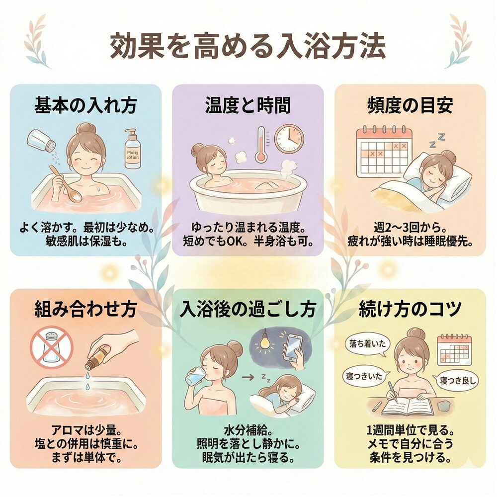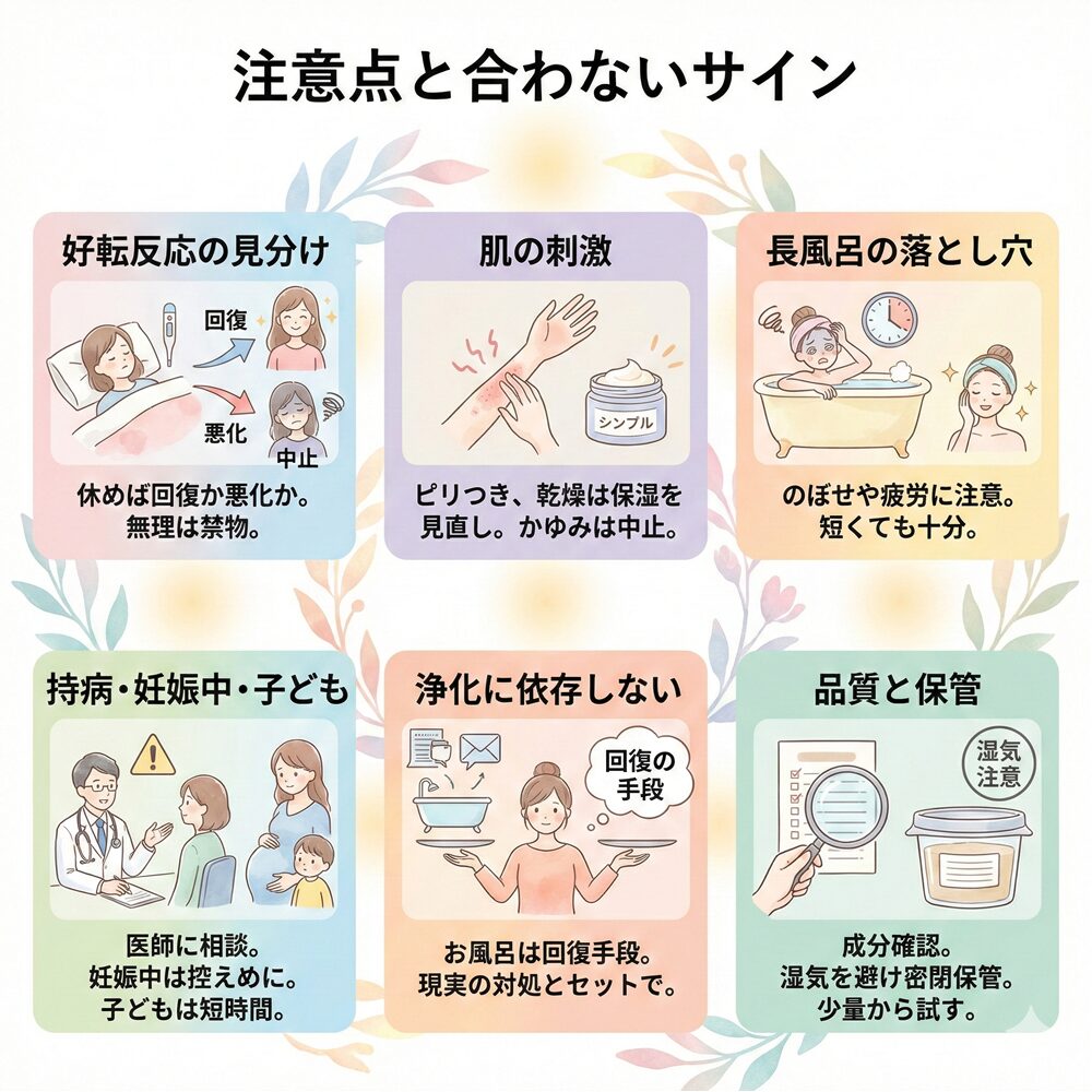 体が冷えやすい、緊張しやすい、眠りが浅いと感じる人は、入浴の恩恵を感じやすい傾向があります。一方で、肌が敏感な人は刺激を感じる場合もあります。最初は頻度を控えめにして、肌や体調の反応を見ながら調整しましょう。体感の強さで良し悪しを判断しないのがコツです。