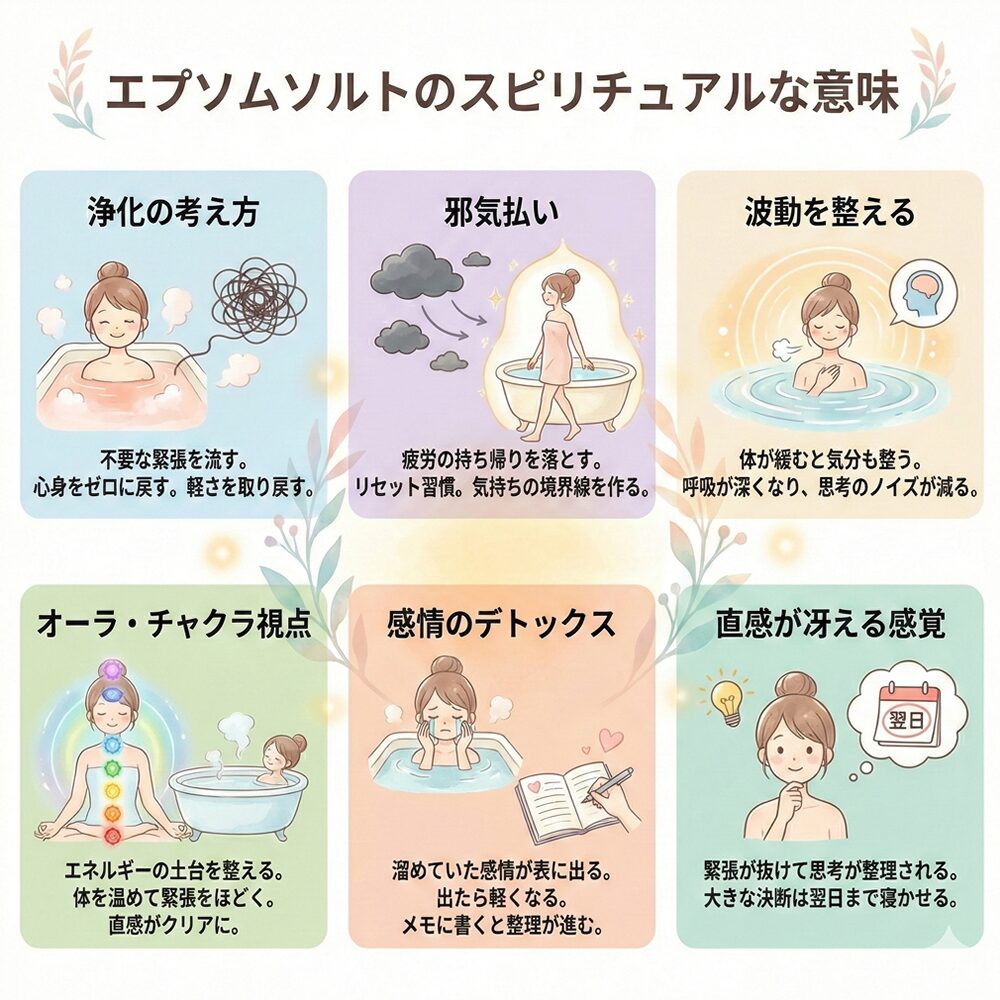 スピリチュアルでいう浄化は、悪いものを追い払うというより「不要な緊張を流す」イメージに近いです。お湯に浸かる行為自体が、心身をいったんゼロに戻す時間になります。エプソムソルトは、その切り替えを意識しやすくしてくれる道具として語られます。怖さではなく、軽さを取り戻す方向で使うのが健全です。
