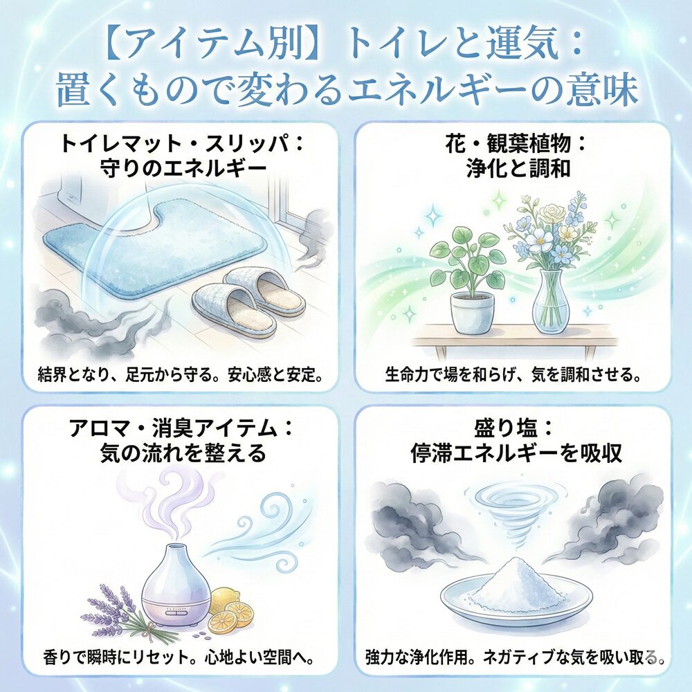 一方で、目的や意味を持って選ばれたアイテムは、トイレの浄化作用を高め、運気の循環をスムーズにしてくれます。何気なく置くのではなく、「なぜこれを置くのか」を意識することが、運の流れを整える重要なポイントになります。