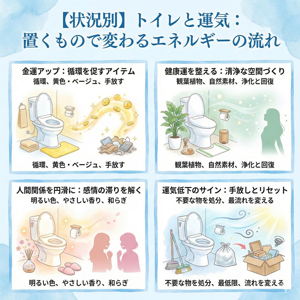 この記事では、トイレに置くと運気が上がるものについて、スピリチュアルな意味を軸に、状況別・アイテム別・色別・人物別に詳しく解説していきます。