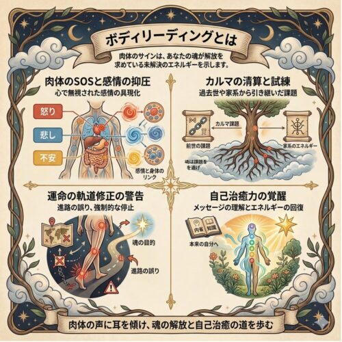 体調不良やトラブルの連鎖の初期にぎっくり腰になるのは、深い課題(自己犠牲、金銭不安)の表面化が始まったサインです。根本的な浄化が必要であることを示唆しています。