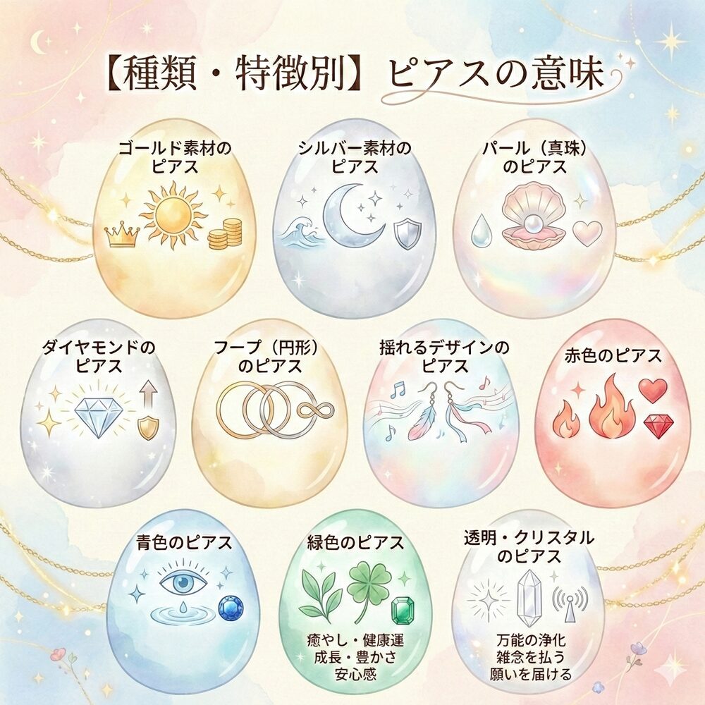 ピアスはあなたの耳元で輝き、運気の入り口を守る大切なパートナーです。場所や色、素材に込められた意味を知ることで、今の自分に必要なエネルギーを意図的に取り入れることができます。「なんとなく」選ぶのではなく、今の願いやなりたい自分をイメージしてピアスを選んでみてください。耳元に小さな光を灯すことで、あなたの人生はより明るく、希望に満ちたものへと変わっていくはずです。
