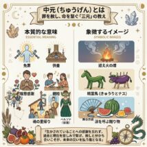 夏の盛り、夕闇に揺れる提灯の灯り。私たちが「お盆」や「お中元」として親しんでいるこの季節の背景には、「中元(ちゅうげん)」という古くからの深い精神性が息づいています。中元は、あの世とこの世の境界が緩まり、離れて暮らす家族 […]