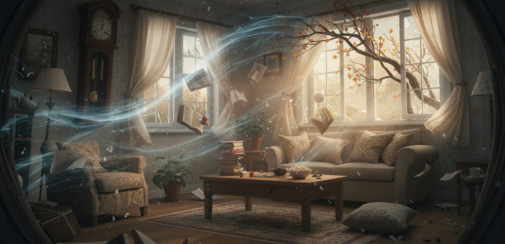室内の物が飛び散る夢は、「心の整理が追いつかない」「感情が乱れやすい状態」を象徴します。物が多く飛ぶ夢ほど、あなたの生活に混乱が起きている可能性が高いサイン。