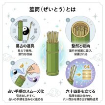 ジャラジャラという独特の音とともに、竹の棒を操って運命を読み解く「易占(えきせん)」。その光景の中で、凛とした存在感を放つ筒状の道具が「筮筒(ぜいとう)」です。 50本の筮竹(ぜいちく)を束ねるこの筒は、占者にとって単な […]
