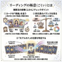 タロットカードを展開法(スプレッド)通りに並べたものの、「1枚ずつの意味はわかるけれど、全体として何を言いたいのか繋がらない……」という壁にぶつかったことはありませんか? 展開法はあくまで「骨組み」です。そこに命を吹き込 […]