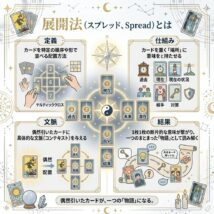 タロットカードを引くとき、ただバラバラに並めるだけでは、カードが何を伝えようとしているのか迷子になってしまうことがあります。そこで重要になるのが「展開法(スプレッド)」です。展開法とは、カードを置く「場所」にあらかじめ「 […]