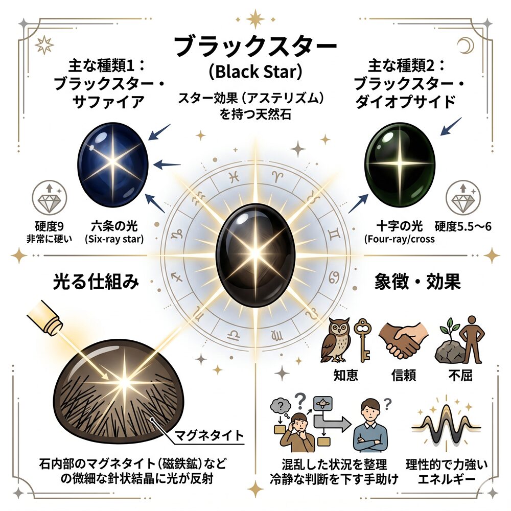 ブラックスターは、石の表面に星型の光の筋が浮かび上がる「スター効果(アステリズム)」を持つ天然石の総称です。主に、以下の2つの種類が有名です。