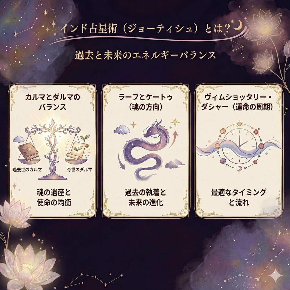 ジョーティシュの核心は、「カルマ(過去の行い)」と「ダルマ(魂の使命)」のバランスにあります。出生図は、あなたが過去世で達成した得意分野(カルマの遺産)と、今世で意識的に取り組むべき使命(ダルマ)を示します。運命の傾向を知り、ダルマに沿って生きることで、カルマの負債を清算できます。