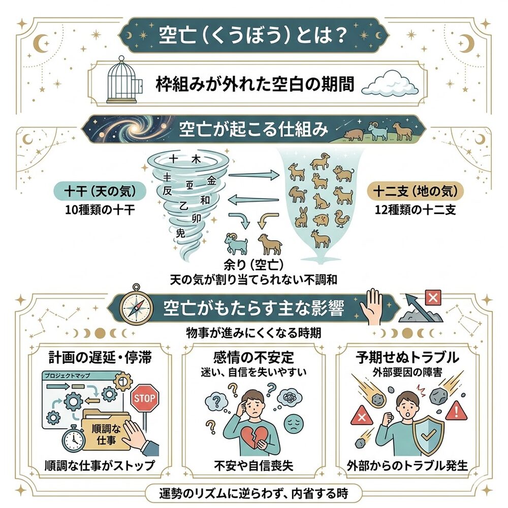空亡とは、文字通り「空(から)で亡(ない)」状態、つまり「枠組みが外れた空白の期間」を意味します。