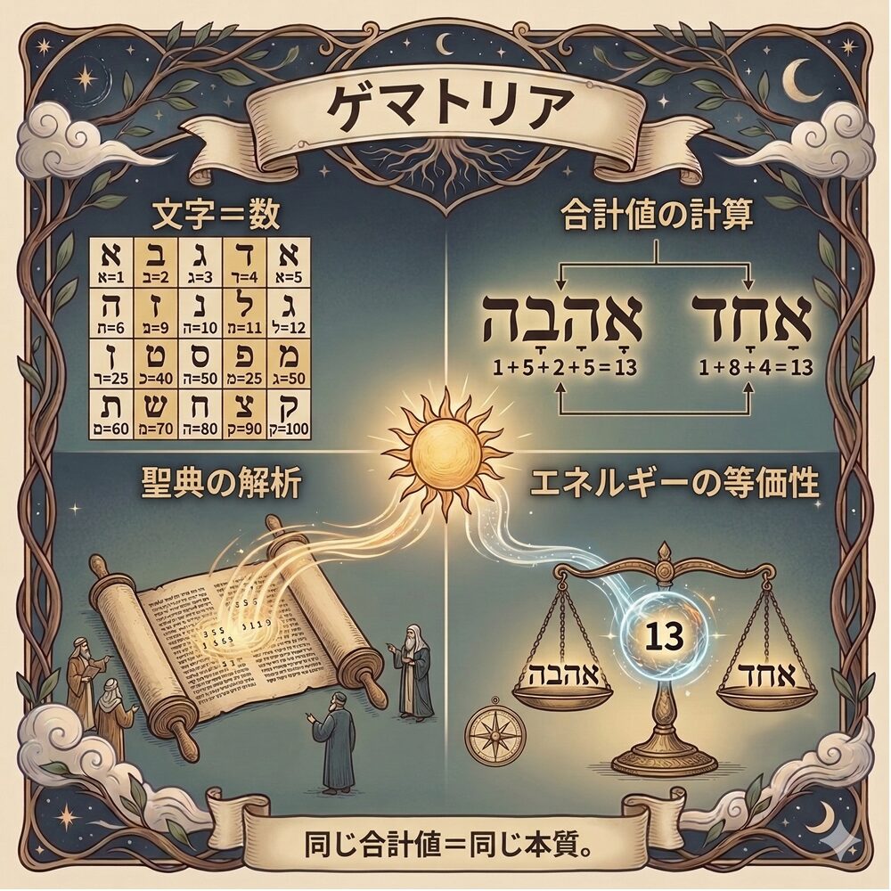 ヘブライ文字には古来、文字としての役割と、数字としての役割の両方が備わっていました。そのため、カバラの実践者たちは聖典(旧約聖書など)を読み解く際、単なる文章としてだけでなく、数値の羅列としても解析を行ってきました。同じ合計値を持つ言葉同士は「本質において等しいエネルギーを持つ」と定義され、表面的な意味を超えた、神の意図や宇宙の調和を発見するための重要なツールとして発展してきたのです。