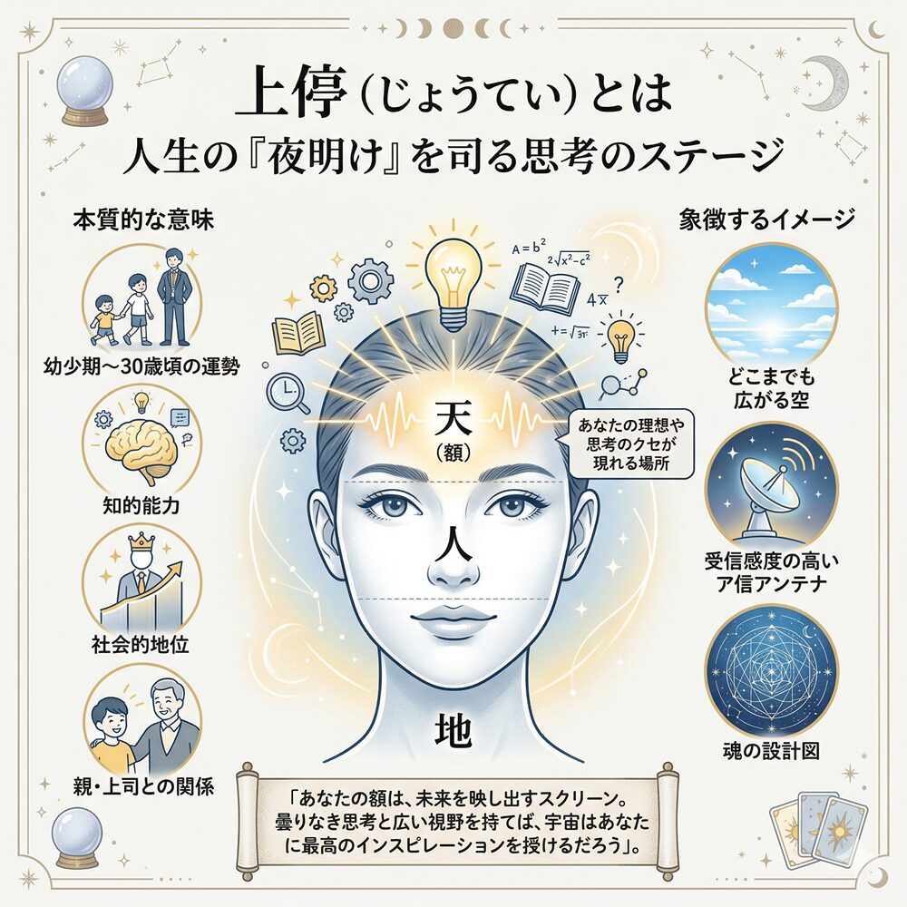 上停(じょうてい)は、私たちに「理想を掲げ、学ぶ喜びを知ること」の尊さを教えてくれます。あなたが額を明るく保ち、広い視野で世界を見ようとする時、上停のアンテナは最高の感度で幸運をキャッチし始めます。若年期を過ぎた人にとっても、上停を整えることは「生涯現役の知性」を保つための秘訣です。