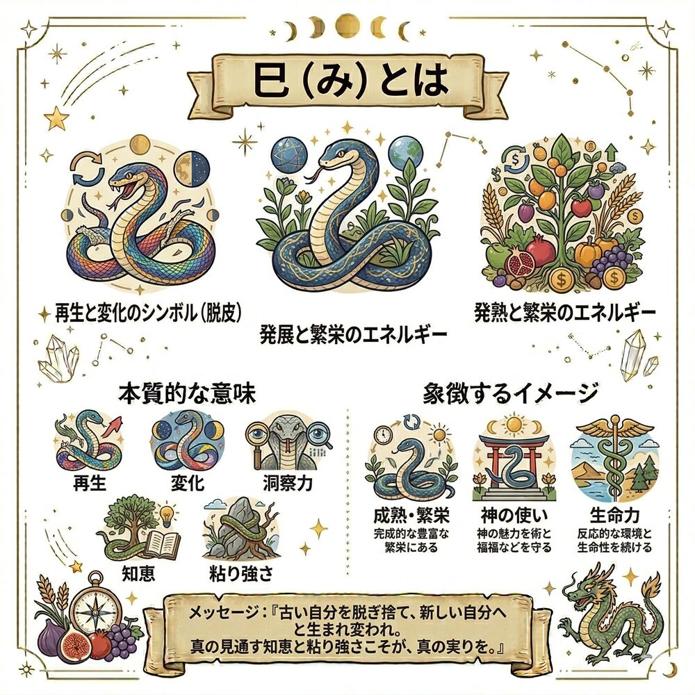 巳(み)は十二支の6番目にあたり、蛇を象徴し、変化や再生、発展を意味する非常に力強い干支です。巳年生まれの人は、その粘り強さと鋭い洞察力を武器に、冷静に成功への道を切り拓く力を持っています。巳の持つ「成熟」と「再生」のエネルギーを意識することで、過去を脱ぎ捨て、新たな繁栄へと向かう充実した人生を築くことができるでしょう。