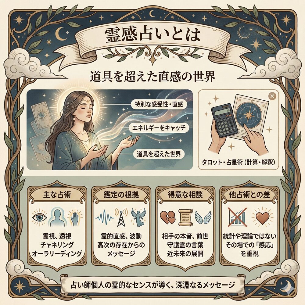 私たちは時に、理屈では説明できない「直感」や「予感」を経験することがあります。霊感占いは、そうした霊的な感受性を極限まで研ぎ澄ませた占い師が、相談者の運命や高次のメッセージを読み解く占術です。統計や道具に縛られない、魂の深層に触れる鑑定の世界を詳しく紐解いていきましょう。